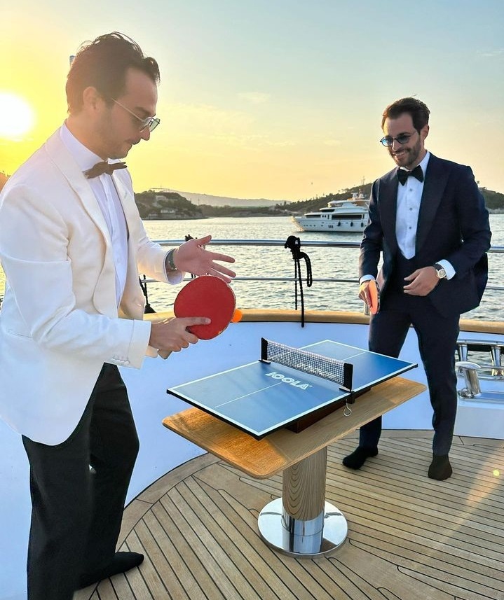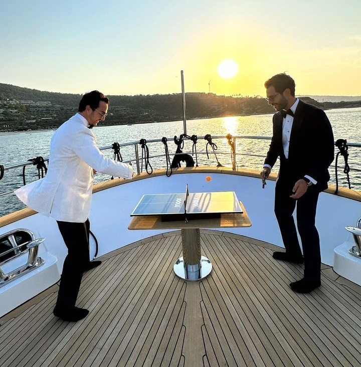 İki arkadaş geçen hafta bir dost daveti öncesi bir araya geldi ve oldukça keyifli anlar yaşadı. Davet vaktini beklerken bu ara çok moda olan mini masa tenisi ile teknenin önünde karşılıklı maç yapan ikili artık üst seviyedeyiz diyerek mutlu anlarını paylaştılar.